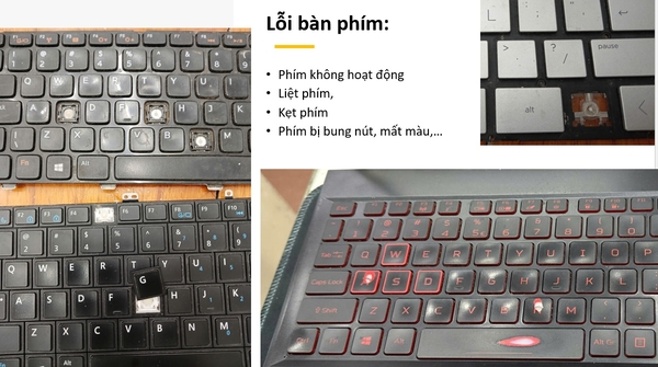- Phím bị liệt, không nhận, một hoặc nhiều phím không hoạt động, nhấn mạnh mới ăn, phím tự nhảy ký tự. Đặc biệt, những bàn phím được thiết kế có nút nguồn khi bị liệt nút nguồn sẽ không bật máy lên nguồn.